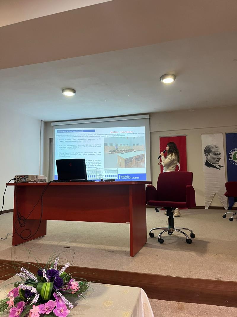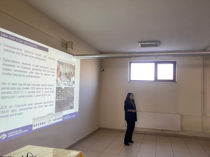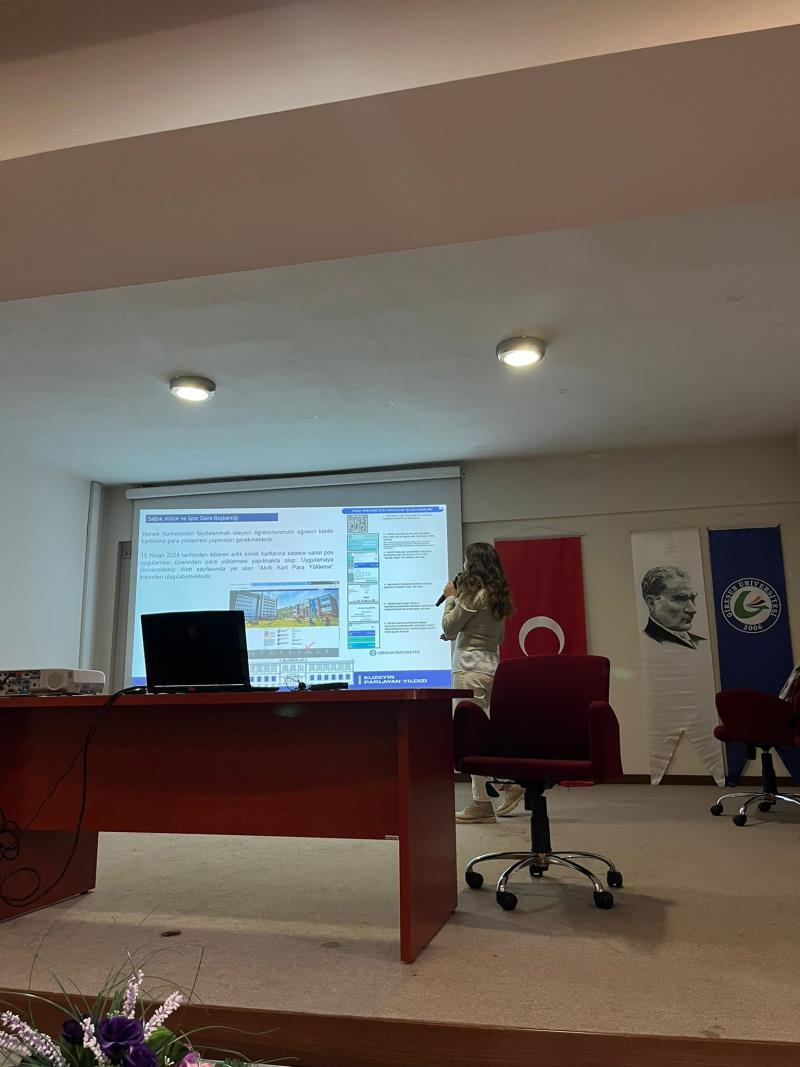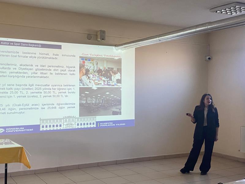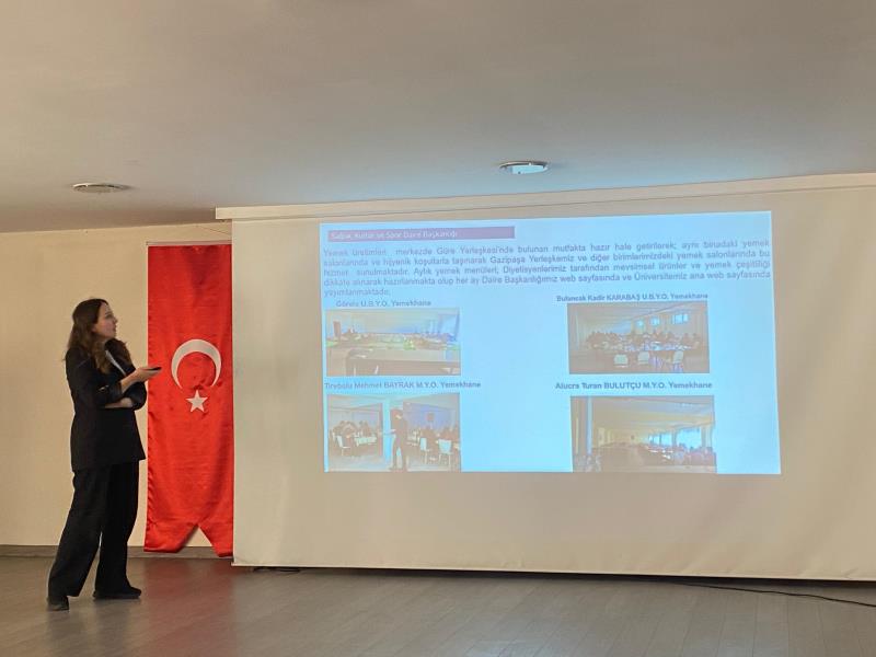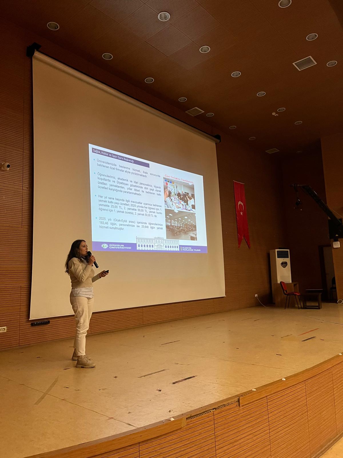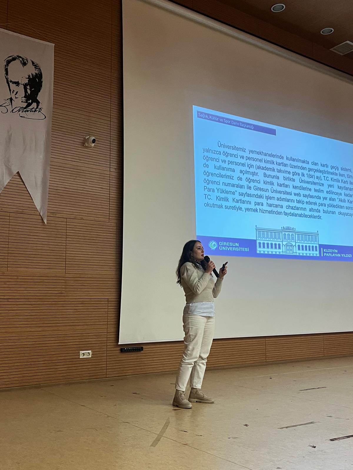 Programda Sağlık, Kültür ve Spor Daire Başkanlığı adına Bilgisayar İşletmeni Hayriye ERKAN; Öğrenci toplulukları, bilimsel ve eğitsel etkinliklerin desteklenmesi, kuruluş yıldönümü, bahar şenlikleri, mezuniyet törenleri, sportif faaliyetlerin desteklenmesi, kısmi zamanlı çalışma imkânları, yemek hizmetleri, ihtiyaç sahibi olan öğrencilere yemek yardımı, kantin, kafeterya hizmetleri konularında önemli bilgiler verdi.