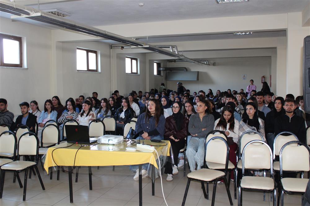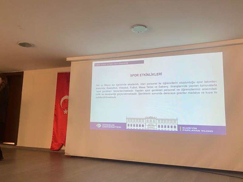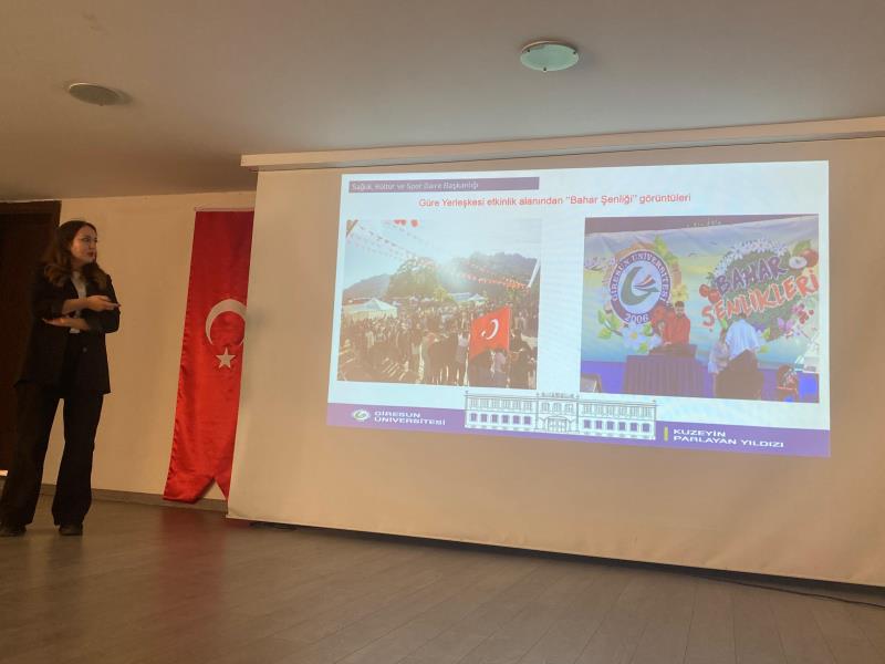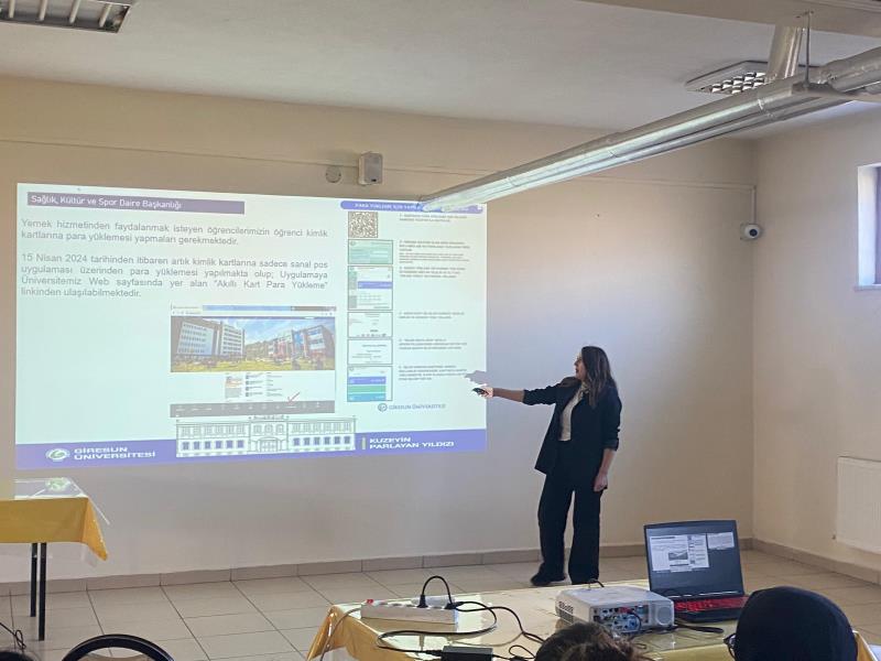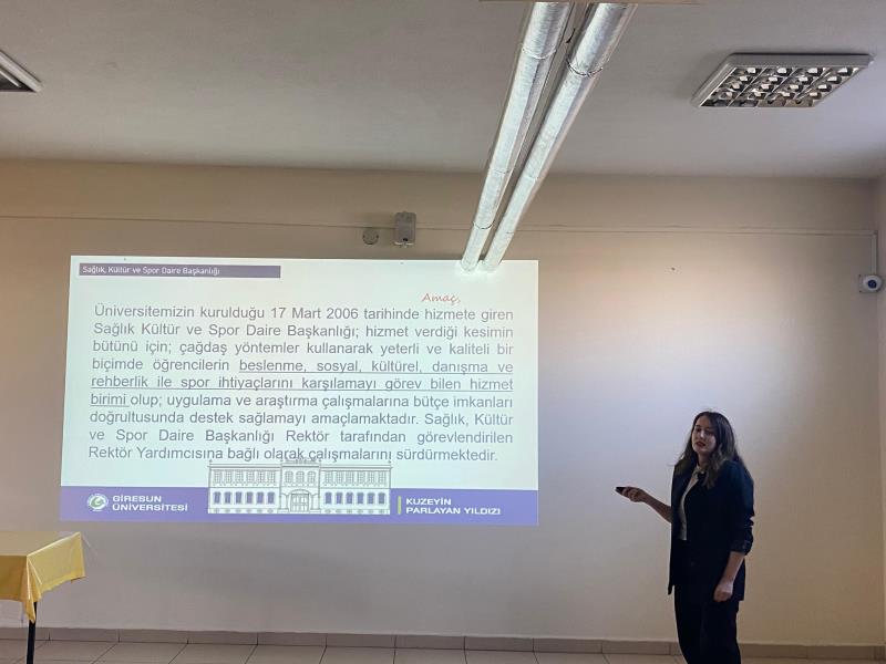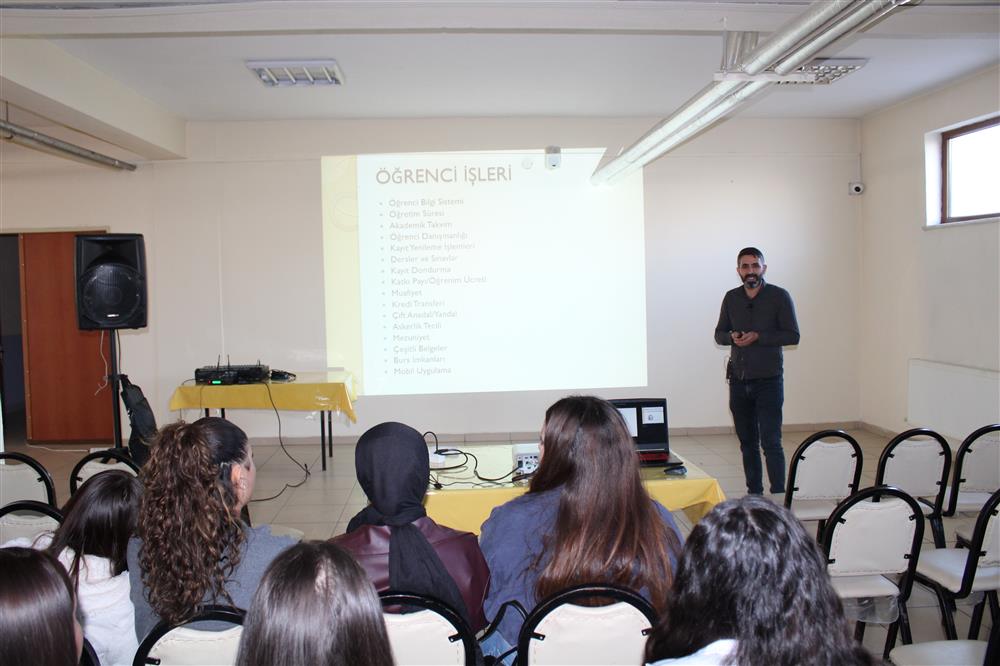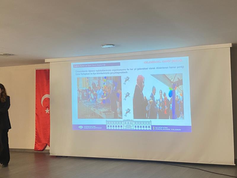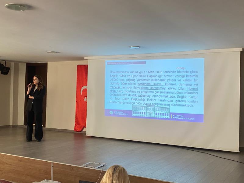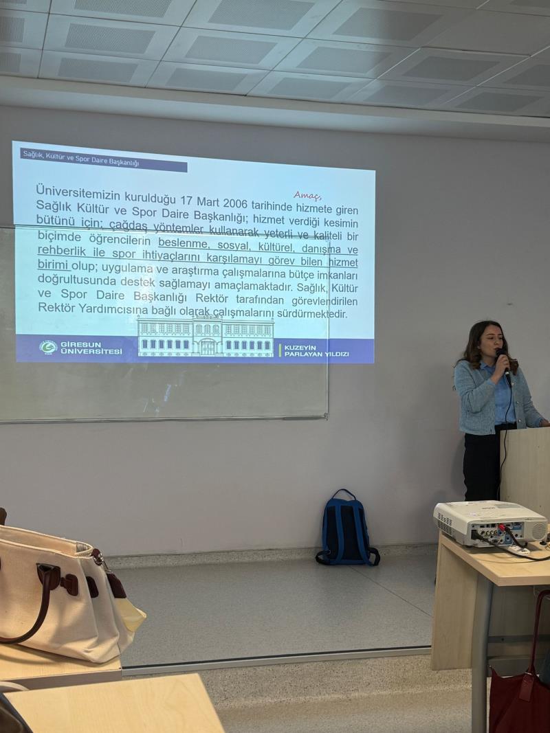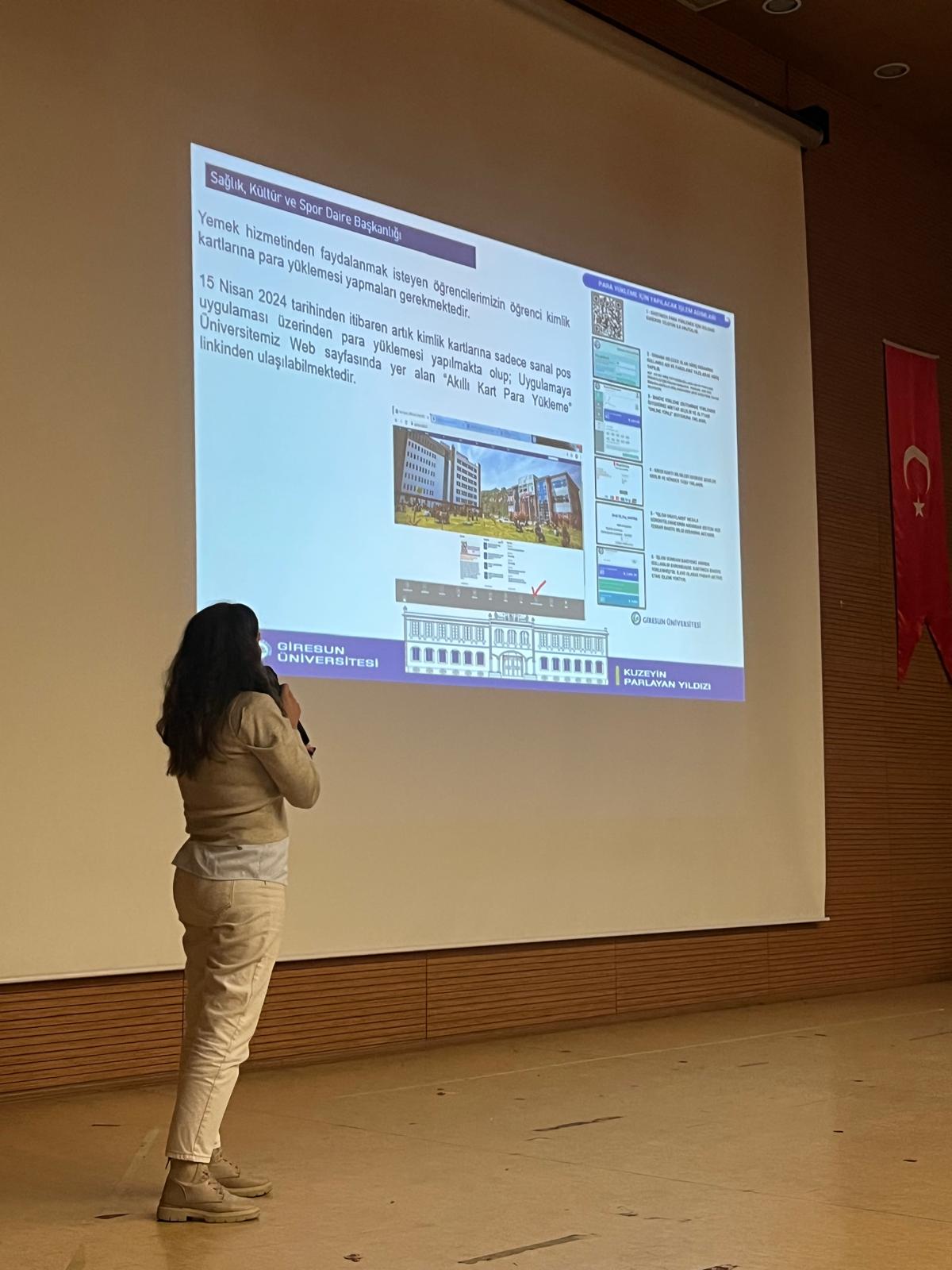 Programda Sağlık, Kültür ve Spor Daire Başkanlığı adına Bilgisayar İşletmeni Hayriye ERKAN; Öğrenci toplulukları, bilimsel ve eğitsel etkinliklerin desteklenmesi, kuruluş yıldönümü, bahar şenlikleri, mezuniyet törenleri, sportif faaliyetlerin desteklenmesi, kısmi zamanlı çalışma imkânları, yemek hizmetleri, ihtiyaç sahibi olan öğrencilere yemek yardımı, kantin, kafeterya hizmetleri konularında önemli bilgiler verdi.